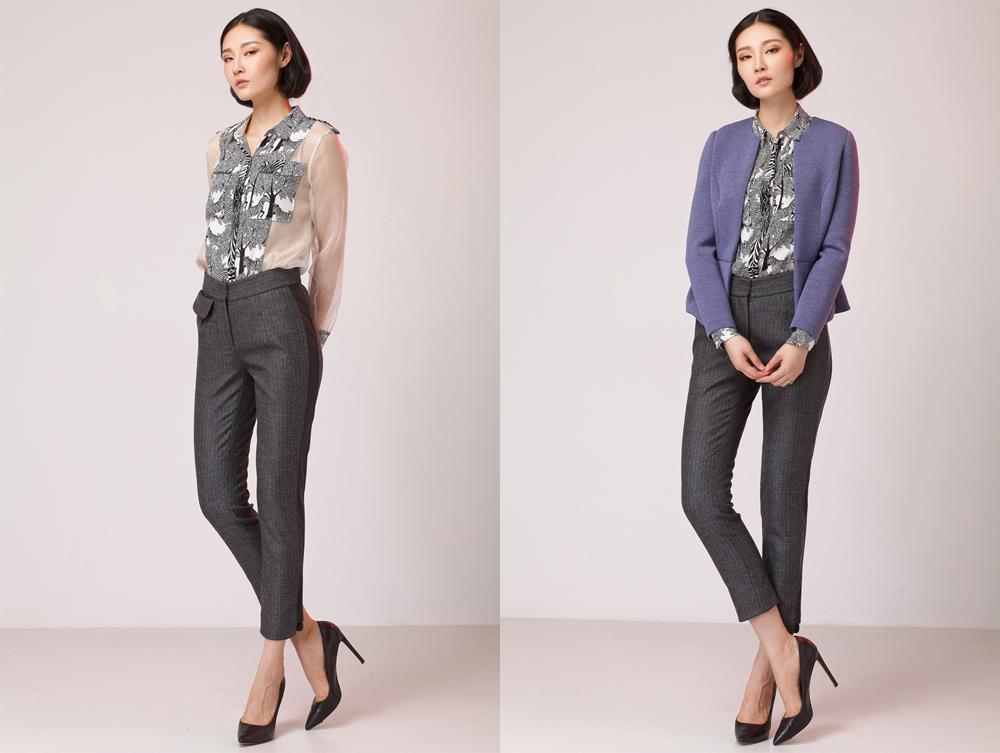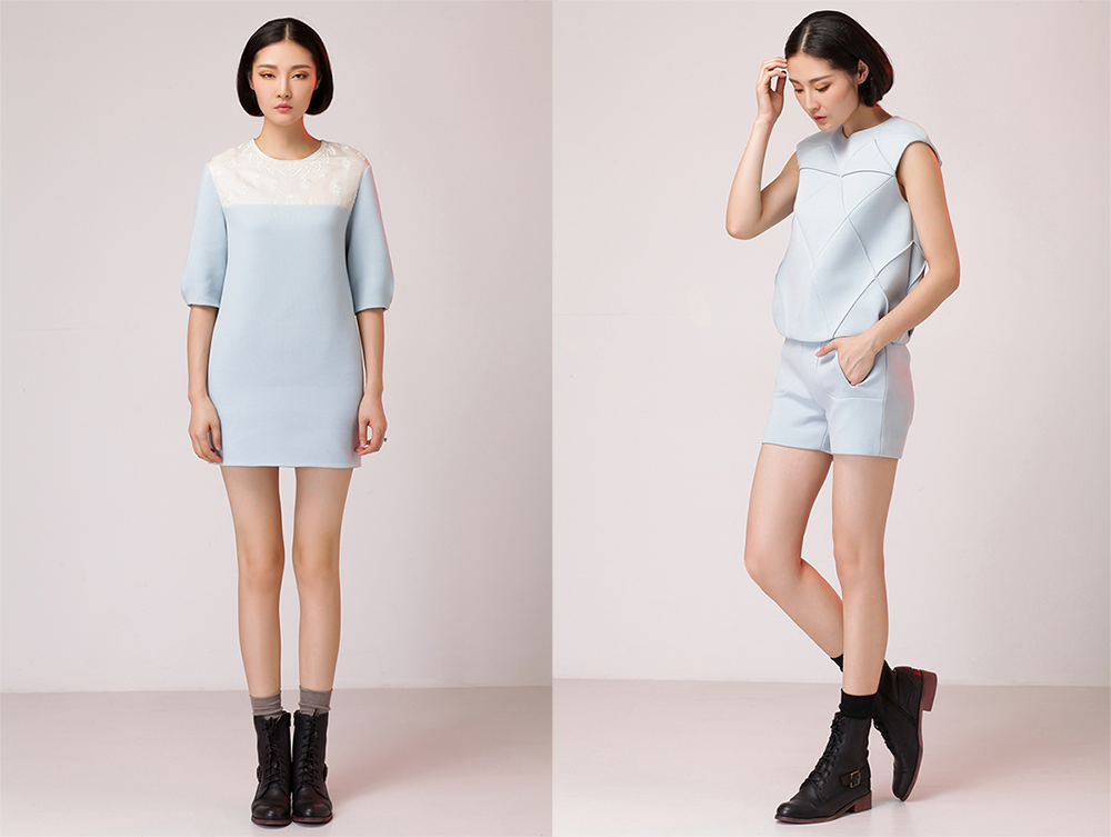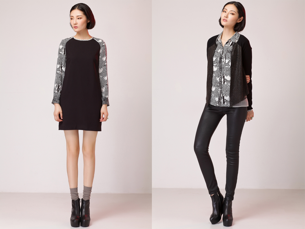14秋冬系列整体简洁又不失设计,廓形上多采用直身H型设计,款式上轻松随意,面料的虚实结合,不同材质的拼接,线条的多与少,松与紧作为对比,体现都市新女性独特的设计感,领口皮质钉珠绣花的点缀,使服装整体更显精致大气。双面羊绒外套简单的线条加入撞色的设计,保暖又不失个性设计,加入一些太空棉的设计,使整体更加丰富立体。工艺上大胆尝试了一些新的组织,更具有设计感。