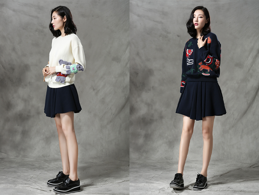 以黑白灰主基调,灰色调成为主流,游走在黑白灰的自由,沉重,出境状态中,本季以聚焦不完美,拥抱个性为主旨,将流行触觉与原创设计完美结合,本季秋冬增加了卫衣单品,以打破常规的思维设计,延续了春夏的设计手法,在春夏的绣花基础上做了延伸,加入大量彩色的贴布绣设计,不同毛织物的结合,展现女性风格和时髦前卫的造型。简单的单品加入可爱的手工小熊设计,赋予卫衣前卫的艺术感。常见的金属配件以实用的方式点缀棱织上衣成为本季的一道闪光点,多种类的轮廓被运用于之上金属配件,彰显现代年轻女性自由、自信的时尚态度。